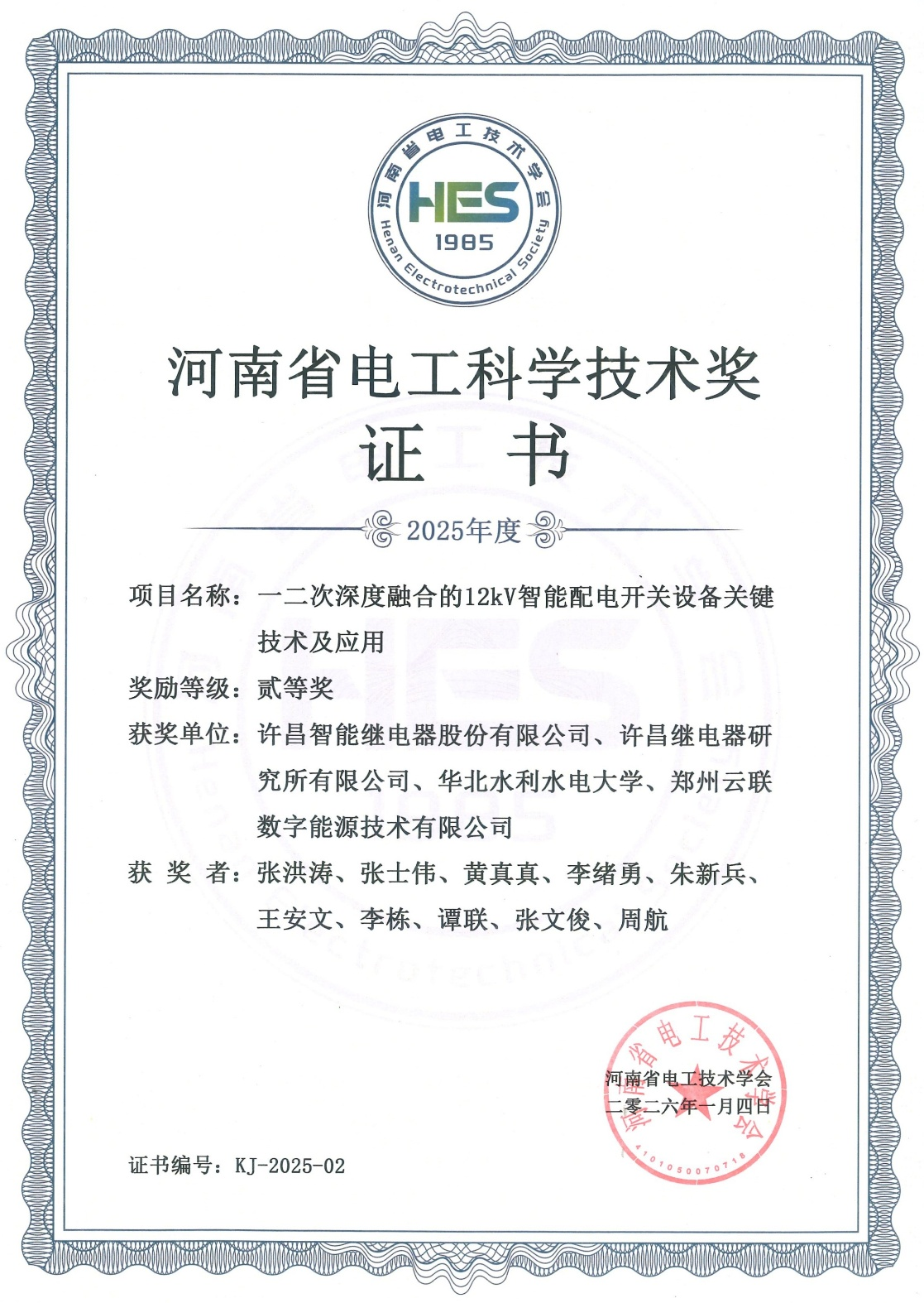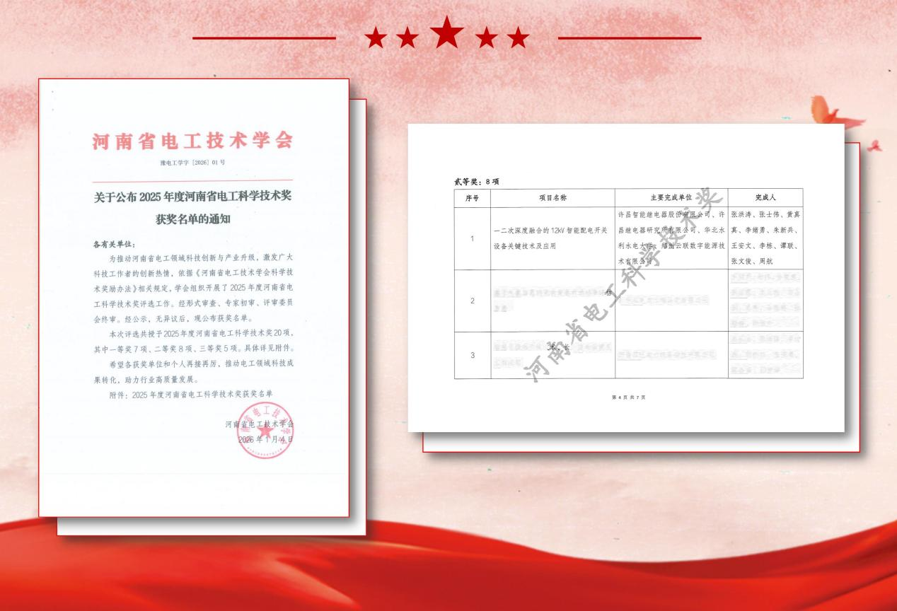 近日,河南省电工技术学会发布了《关于公布2025年度河南省电工科学技术奖获奖名单的通知》,由许昌智能继电器股份有限公司牵头,联合许昌继电器研究所有限公司、华北水利水电大学、郑州云联数字能源技术有限公司共同研发的“一二次深度融合的12kV智能配电开关设备关键技术及应用”项目荣获2025年度河南省电工科学技术奖二等奖,充分彰显了许昌智能在配电一二次融合技术领域的科研实力与创新水平。