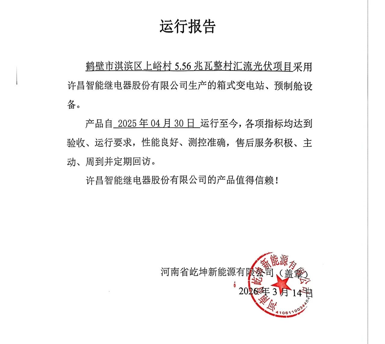 信中提到,自2025年4月30日投运至今,由我公司提供的箱式变电站设备已稳定运行超过300天,各项指标表现优异,为光伏项目的平稳发电与并网提供了坚实保障。这不仅印证了许昌智能产品的可靠性与技术实力,也再次彰显了公司在新能源装备制造领域的领先水平。