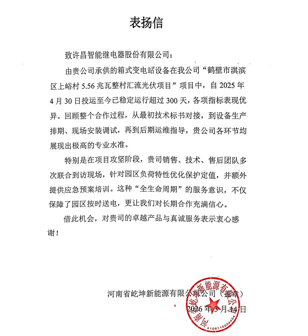 近日,许昌智能继电器股份有限公司凭借卓越的箱式变电站产品及全方位的服务体系,收获同一客户——河南省屹坤新能源有限公司发来的多封表扬信。信中对我公司在“鹤壁市淇滨区上峪村5.56兆瓦整村汇流光伏项目”及“鹤壁市淇滨区上庄村5.9兆瓦整村汇流光伏项目”中承供的箱式变电站设备给予高度评价,并对许昌智能在合作全过程中展现出的专业素养与责任担当表示由衷感谢。